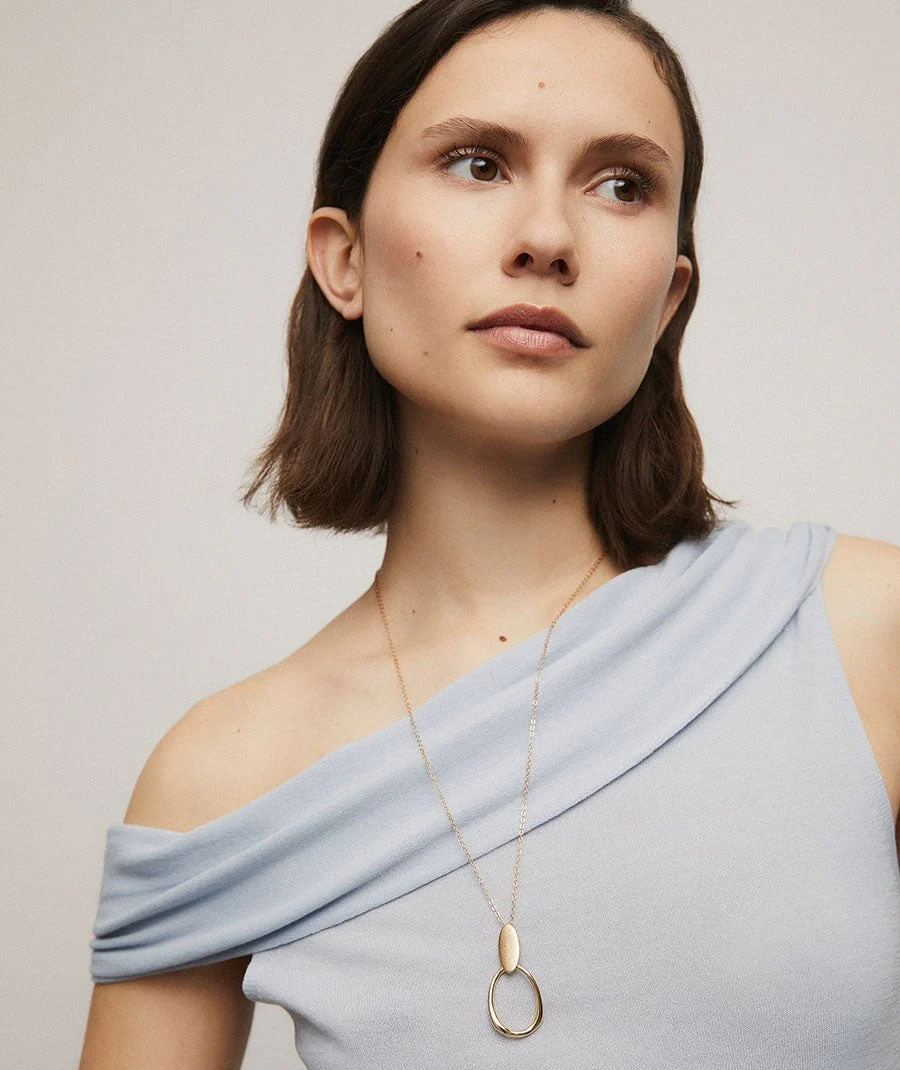 El colgante Hali de la colección Textures está chapado en Oro de 18kt. Con una longitud de 60 cm más una cadena ajustable de 6 cm, este elegante colgante presenta un diseño sofisticado y versátil que realza cualquier atuendo con un toque de distinción.