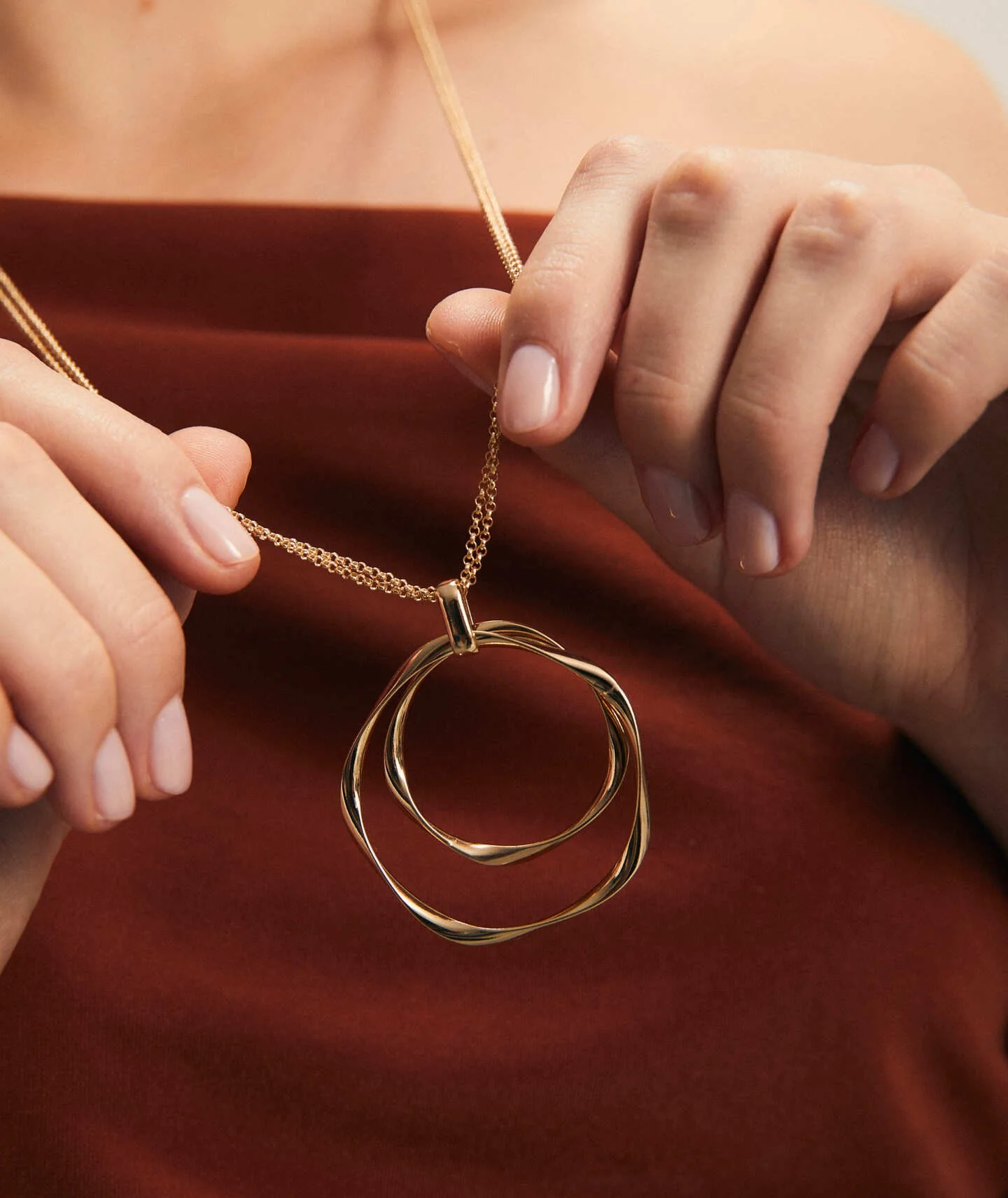 Colgante Wave colección Orígenes Chapado Oro 18 Kt con doble aro de diferente tamaño y forma irregular. Medida de la cadena 60cm + 6cm ajustable.