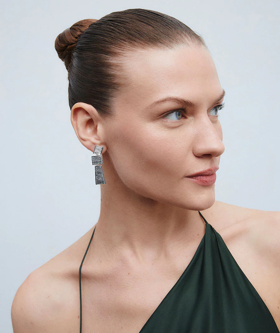 Pendientes largos geométricos Horizonte bañados con un espesor de plata de ley 925 de 5 micras o más, lo que garantiza una mayor durabilidad y brillo prolongado. Tienen una longitud de 46 mm y un cierre a presión.