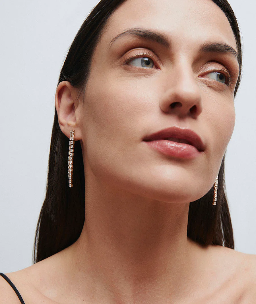 Pendientes largos Lucent cascada bañados con una gruesa capa de oro macizo de 18 kt, lo que garantiza una mayor durabilidad. Engastados con circonitas blancas, cuya similitud con el diamante es casi indistinguible. Tienen una longitud de 53 mm y un cierre a presión.