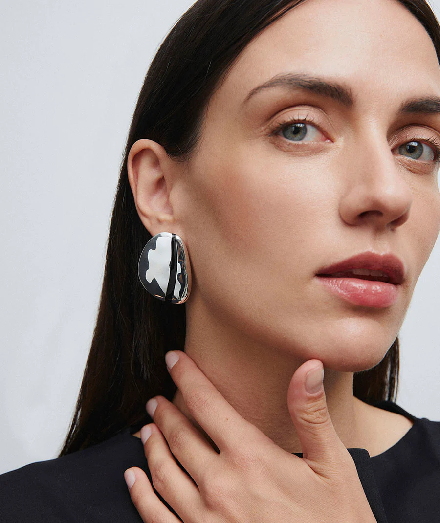 Pendientes volumen Horizonte bañados con una gruesa capa de Plata de ley 925, lo que garantiza una mayor durabilidad. Destacan por la piedra esmaltes en tono negro, que aporta textura, brillo y un gesto de estilo propio. Tienen una longitud de 40 mm y un cierre a omega.