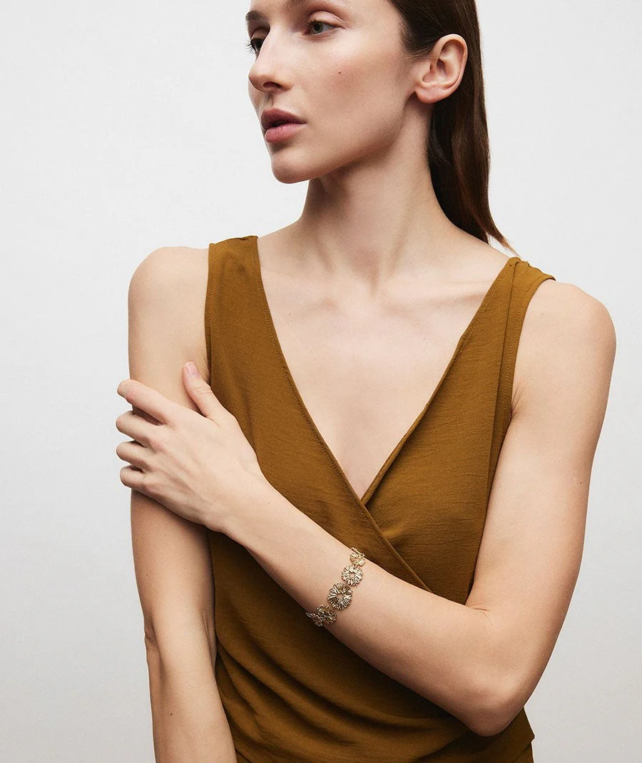 Pulsera Estiu en forma de flores, bañada en Oro de 18 kt, elaborado bajo los más altos estándares de calidad para garantizar una mayor durabilidad.. Cadena ajustable, con una longitud de 17 cm + 3 cm.